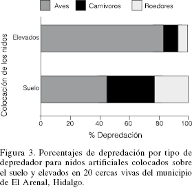 El mayor porcentaje de depredación de los nidos elevados fue ocasionado por aves, seguido por carnívoros y finalmente por roedores. Para los nidos colocados sobre el suelo, los carnívoros fueron los depredadores principales, seguidos por las aves y finalmente por los roedores (Figura 3).