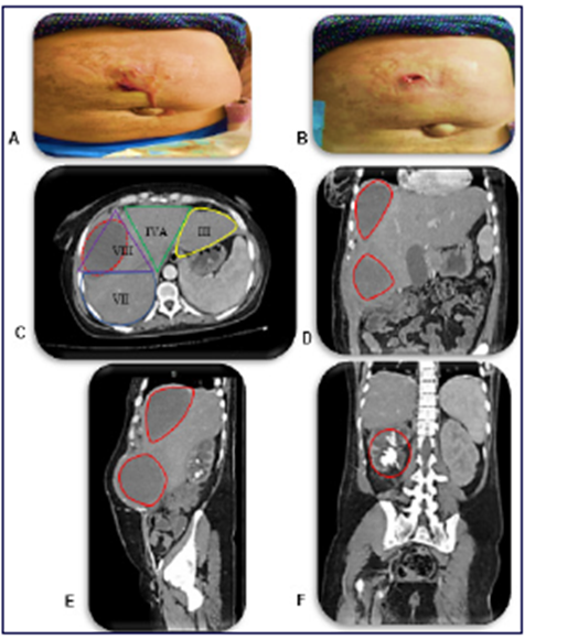 Figura 1 Examen fisico de pared abdominal. A. Salida de exudado purulento a través de pared abdominal. B. Se evidencia perdida de solución de continuidad de 2 cm en epigastrio. C. Corte axial de tomografía de abdomen y pelvis contrastada, donde se observa (Linea roja) absceso hepático en segmento hepático VIII con medidas de 10 x 5,9 x 8 cm con un volumen promedio de 250cc y su relacion con la segmentaciòn hepática, representada por lineas de colores: Azul (VII), Morado (VIII), Verde (IV A), Amarillo (III). D. Corte Coronal de tomografía de abdomen y pelvis contrastada, donde se observa (Lineas rojas) abscesos (Superior, hepático) e (Inferior, pared abdominal anterior). E. Corte Sagital de tomografía de abdomen y pelvis contrastada, donde se observa (Lineas rojas) abscesos (Superior, hepático) e (Inferior, pared abdominal anterior). F. Corte Coronal de tomografía de abdomen y pelvis contrastada, donde se observa (Linea roja) riñón derecho con litiasis coraliforme.