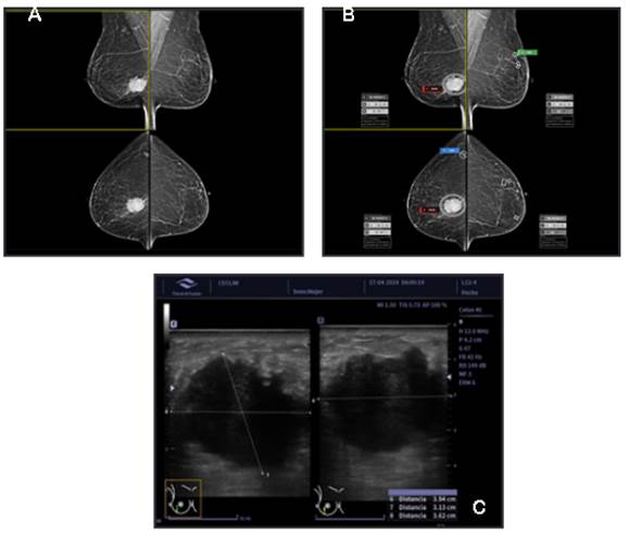 Figura 1 A. Paciente de 48 años con una masa palpable en el cuadrante inferior de su mama derecha. 1.B. El algoritmo de IA identifica la lesión como altamente sugestiva de malignidad. 1.C. En la ecografía, una masa sólida irregular altamente sospechosa. Centro Clínico de la Mama - CECLIM, Caracas - Venezuela. Work station for mammography, DIARM DM™, y brAInray™, Artificial Inteligence for Mammography, USA, 2024, http://www.medicalscientific.com/