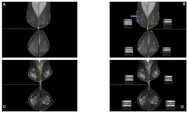 Figura 2 Una de las áreas más desarrolladas en los algoritmos de IA es la evaluación de la densidad mamaria. 2.A. Esta es una paciente de 66 años de edad con mamas fundamentalmente adiposas, categorizado por el algoritmo de IA como ACR A, sin ningún otro hallazgo sospechoso. 2.B. Esta categorización de la densidad mamaria por el algoritmo de IA coincidió con la impresión de 4 radiólogos expertos en mamografía. 2.C. Esta es una paciente de 52 años con mamas heterogéneamente densas, categorizada por el algoritmo de IA como ACR B, sin ningún otro hallazgo sospechoso. 2.D. Esta categorización de la densidad mamaria por el algoritmo de IA no coincidió con la apreciación de los 4 radiólogos, quienes concluyeron ACR C. Centro Clínico de la Mama - CECLIM, Caracas - Venezuela Work station for mammography, DIARM DM™️ and brAInray™️, Artificial Inteligence for Mammography, USA, 2024 http://www.medicalscientific.com/