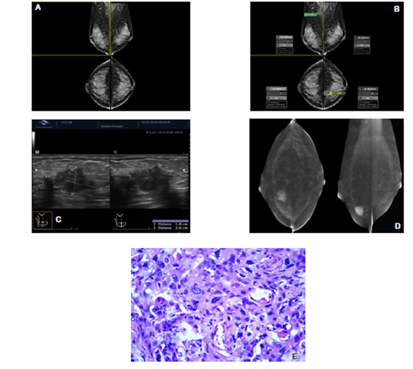 Figura 3 A. Paciente de 43 años con una masa palpable en su mama derecha. No es evidente por Mamografía Digital. 3.B. No identificada por algoritmo de IA. 3.C. En la ecografía una masa sólida irregular altamente sospechosa. 3.D. En la Mamografía con Contraste la imagen recombinada resalta una masa en su polo inferior (hipercaptante). 3.E. Carcinoma ductal infiltrante en la biopsia con aguja gruesa. Centro Clínico de la Mama - CECLIM, Caracas - Venezuela. Work station for mammography, DIARM DM™ and brAInray™, Artificial Inteligence for Mammography, USA, 2024, http://www.medicalscientific.com/