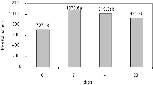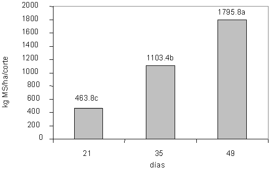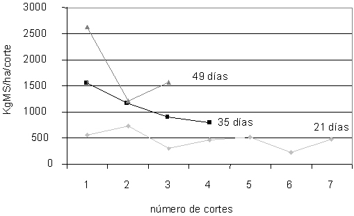 El corte o defoliación afectó la producción de materia seca total, aumentando a medida que se disminuye la frecuencia de corte. De esta manera los mejores resultados en producción de forraje se obtuvieron con los cortes menos frecuentes cada 49 días.