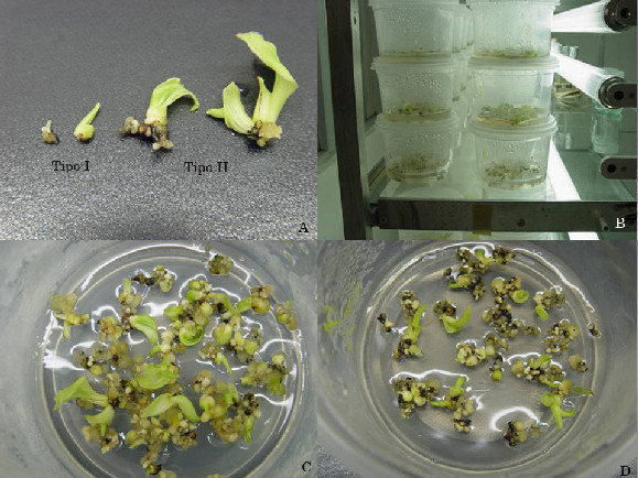 A los 15 días se determinó el número de embriones somáticos con germinación tipo I y tipo II según la clasificación establecida por Escalant et al. (3). La germinación de tipo I correspondió a los embriones germinados con plúmula clorofílica expuesta (pequeña protuberancia de color verde). Mientras que la germinación de tipo II correspondió a los embriones germinados completamente, o sea formación de plantas con hojas abiertas.