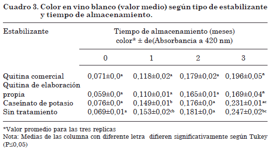 El cuadro 3, muestra el color en los vinos blancos tratados con los distintos estabilizantes, para 0, 1, 2 y 3 meses de almacenamiento. Se obtuvo un aumento progresivo en el color durante todo el período de almacenamiento, no obstante, los vinos tratados con los estabilizantes ensayados arrojaron menores valores de color, que el vino control (sin tratamiento). Además se observa que los estabilizantes no eliminan la tendencia natural del vino al pardeamiento u oscurecimiento, sin embargo, conducen a valores finales que son, en todo caso, más bajos que los del vino control.