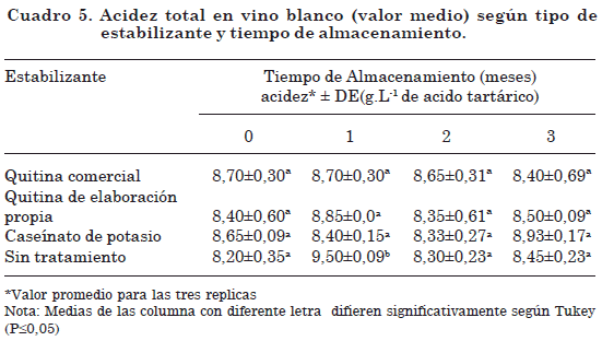 Los tratamientos de estabilización con quitina comercial, quitina de elaboración propia y caseínato de potasio, no afectaron la acidez de los vinos obtenidos para un nivel de significancia del 1%.