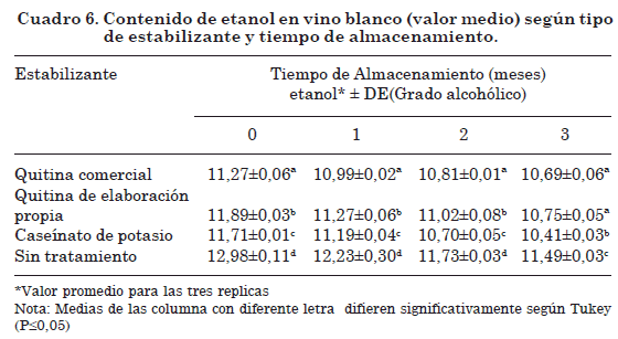 El cuadro 6, muestra el contenido de etanol en los vinos blancos tratados con los diferentes estabilizantes, para 0, 1, 2 y 3 meses de almacenamiento. Se obtuvo una disminución progresiva del grado alcohólico para todos los vinos obtenidos durante todo el período de almacenamiento, la cual es producto de perdidas por evaporación y oxidación a acido acético por bacterias acéticas. Los vinos al contacto con el aire, son capaces de oxidar el alcohol produciendo cantidades elevadas de acido acético (Amerine, et al. 1976).
