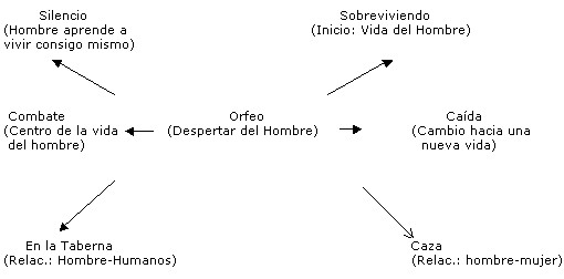 En el texto Orfeo la imagen simbólica arquetípica se relaciona con el mito griego de Orfeo esposo de Eurídice, la que al morir desciende al Hades y Orfeo va tras ella porque quiere recuperarla. En el Hades cautiva a los dioses infernales con su música y deciden devolverle a Eurídice, pero la condición era que no volviese a ver la figura de su esposa hasta que dejaran el mundo infernal, él no resiste y voltea y vuelve a perder a Eurídice quedando solo y desolado. Ahora bien, el personaje principal se siente como Orfeo o en todo caso lo representa en su proceso evolutivo. Sin embargo, lo que vive el personaje protagonista con los demonios del centro de la tierra le permite adoptar una posición que lo induce hacia su carácter humano y aún cuando siente nostalgia decide por lo humano: