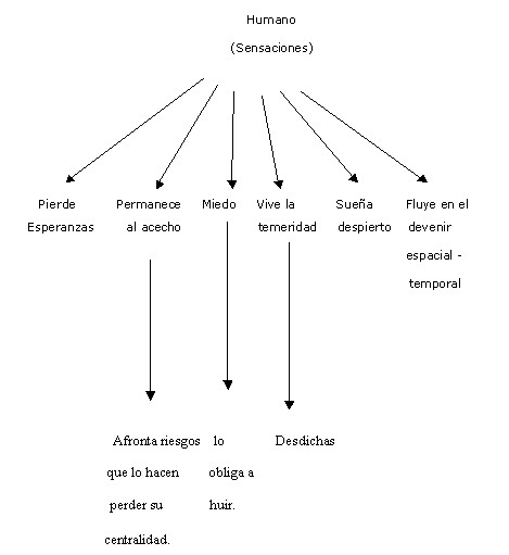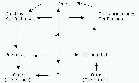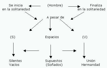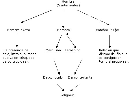 En cuanto a los dos textos Soledades y Uniones, el hombre permanece en un solo: Combate, ya que su vida se desarrolla desde el inicio en un decurso temporal que perdura hasta el fin. Y esa vida es una constante lucha que se relaciona con los cambios y mutaciones que lo llevan a ser humano, en los cuales ni siquiera siendo preparado como guerrero está a salvo de otros y de sí mismo. Inclusive, luego de llegar a ser totalmente humano empieza el otro problema: la compañía con el otro sujeto (femenino) que también lo mantiene en un constante estado de alerta. Quizá lo más relevante es este combate que da nombre a la novela: un combate que tiene un entorno cíclico y un centro del ser del individuo (Ver gráfico 6).