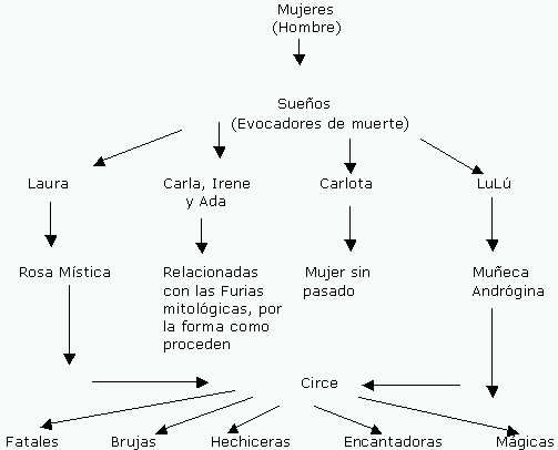 Cada una de la mujeres anteriormente descritas aparecen en los textos: Laura y las Colinas, Amanecer en la Terraza, Rosa Mística, Laura y el Arlequín, Las Furias, Sombras en el Agua, y Cartas de Relación (Ver gráfico 5).