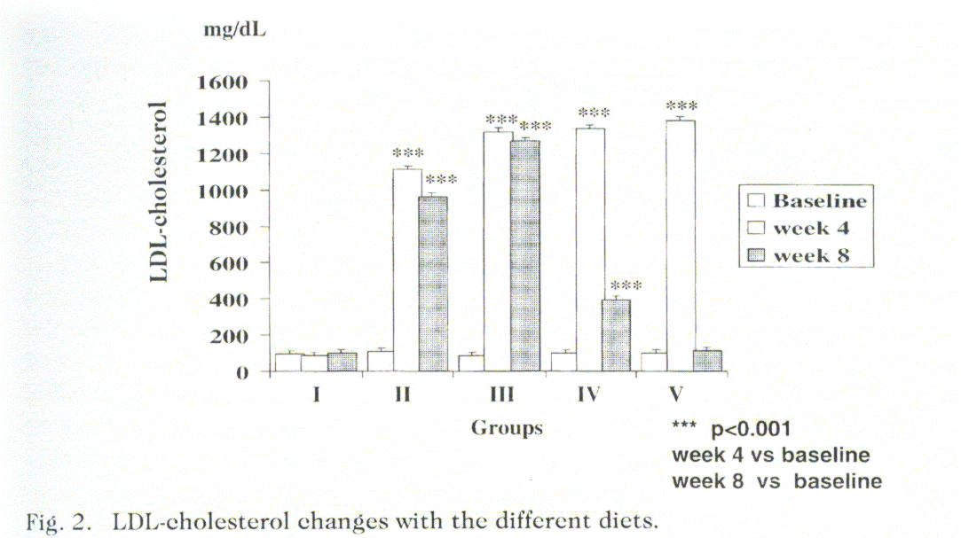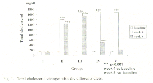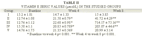 Baseline values of Vitamin E in all groups were similar. Group I did not show significant differences at any point during the study. Group II, which received a hypercholesterolemic diet during the whole experiment, did not exhibit significant differences between baseline values and w4 values (p0.05); in contrast, it showed significant differences between baseline values and w8 values (p<0.001), and between the values of w4 and w8 (p<0.001). Group III did not present significant differences between baseline values and w4 values (p>0.05) while it did show significant differences between baseline values and w8 values (p<0.001), and between the values of w4 and w8 (p<0.001). This group had the highest Vitamin E value. Group IV did not show significant differences between baseline values and w4 values, while significant differences were found between baseline values and w8 values (p<0.001), and between the values of w4 and w8 (p<0.001). Group V showed a tendency to increase its baseline values at 4 weeks, but the increase was not statistically significant (p>0.05); similarly, this group did not show significant differences during other periods (Table II).