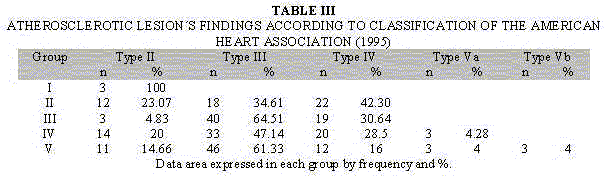 Regarding the histological study of this investigation, when comparing the results of Groups II and III, it is observed that in the former group, Type IV/Type III lesions relationship was higher (1.22) than groups III (0.47). In this sense, it is important to notice that Type IV lesions are more advanced than Type III lesions. However, when comparing Group IV and V it is observed that in group IV, which incorporated Vitamin E between w4 and w8 showed that Type IV /Type III lesions relationship is higher (0.6) than groups V (0.26). Group V results could be attributed to the fact that advanced structural damage induced by the hypercholesterolemic diet cannot not be reverted by a normal diet only. Therefore, these results do not permit to conclude that Vitamin E reduces atherosclerotic plaque development.