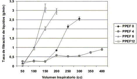Los pulmones ventilados con una PPEF de 0 cmH2O sufrieron ruptura a un alto VI, alcanzando valores de ruptura de 300 cc. Concomitantemente se evidenciaron incrementos significativos en la Pap y en la TFL (p < 0,05) cuando se comparó con el grupo PPEF 4 cmH2O. Aquellos ventilados con PPEF de 4 cmH2O no sólo alcanzaron un VI elevado (400cc) sino que fueron también aquellos que desarrollaron menos edema (TFL = 0,89 ± 0,07 g/min vs. 2,55 ± 0,06; 2,95 ± 0,13; 3,13 ± 0,21 g/min para el grupo celular con PPEF 4, 0, 8 y 12 cmH2O respectivamente con una p < 0,05 ) y en los cuales la Pap fue más baja (PapPPEF4 = 37 ± 0,9 cmH2O vs PapPPEF0 = 40,25 ± 5,73 cmH2O, PapPPEF8 = 68,66 ± 0,92 cmH2O, PapPPEF12 = 76 ± 1,4 cmH2O para el grupo celular; con una p < 0,05 cuando se comparó PPEF4 cmH2O con PPEF 8 y 12 cmH2O). Los pulmones ventilados con una PPEF de 8 cmH2O alcanzaron VI más bajos (200 cc), desarrollaron mayor edema pulmonar e incrementos estadísticamente mayores de la Pap, si se compara con aquellos ventilados con PPEF de 4 cmH2O (p < 0,05). Finalmente, las preparaciones sometidas a una PPEF de 12 cmH2O, fueron el grupo que alcanzó el VI más bajo (150 cc) y, adicionalmente, fue el grupo con niveles más altos de TFL y de Pap, diferencia estadísticamente significativa (p < 0,05) cuando se comparó con PPEF 4 (Tabla II). La Fig. 2 resume la evolución de la TFL a medida que se aumentó el VI y a los diferentes niveles de PPEF en las PC.