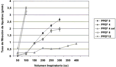 En este estudio se puede apreciar, en primer lugar, el efecto del uso de varios niveles de PPEF (0, 4, 8 y 12 cmH2O) a niveles crecientes de VI y, en segundo lugar, la diferencia existente entre dos grupos principales: el grupo celular y el grupo acelular.