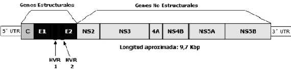 Los genes estructurales: core (C) y envoltura (E1 y E2), están localizados en la zona próxima al extremo 5´ del genoma, mientras que los genes no estructurales (NS2, NS3, NS4A, NS4B, NS5A, NS5B) son adyacentes al extremo 3´ (20). Los extremos 5´ y 3´ son secuencias no codificantes (UTR, unstranlated region) de secuencias muy conservadas entre diferentes cepas del virus (Fig. 1) (19, 21).