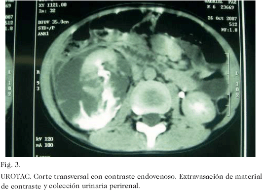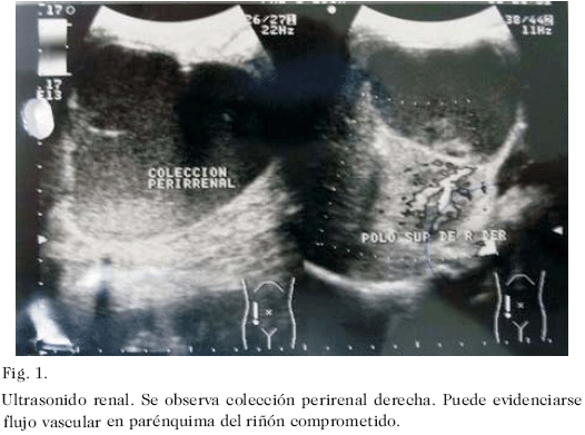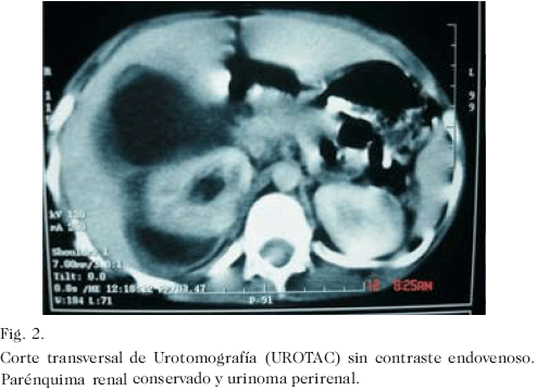 Escolar masculino de 6 años de edad quien acudió a la emergencia del Hospital Universitario de Maracaibo, 1 hora posterior a presentar contusión lumbar derecha al caer sobre su altura, que ocasionó dolor local de fuerte intensidad y hematuria macroscópica. El examen físico reveló paciente en regulares condiciones generales, con moderada palidez cutáneo-mucosa, pulsos periféricos débiles, 139 pulsaciones y 32 respiraciones por minuto. La valoración abdominal evidenció dolor a la palpación desde hipocondrio hasta fosa iliaca derecha, con contractura muscular voluntaria. Se indicó expansión vascular con solución de Ringer Lactato, a razón de 20 mL kg/peso. Sus condiciones hemodinámicas se mantuvieron estables. Se indicó hidratación de mantenimiento. La hemoglobina descendió 3,1 g% en las primeras 48 horas. Se indicó concentrado globular cuando las cifras de hemoglobina descendieron hasta 6,8 g%. Se realizó eco-doppler renal al ingreso en la emergencia que reportó compromiso de parénquima derecho con presencia de flujo vascular y colección peri renal (Fig. 1). Se practicó tomografía computadorizada simple 10 días posteriores al ingreso; en los cortes sin contraste (Fig. 2), se comprobó la colección observada en el ecograma. Cuando se administró contraste endovenoso, se evidenció extravasación del material de contraste al espacio retroperitoneal derecho (Fig. 3). A los 16 días del accidente se drenó el urinoma en quirófano con un nefrostomo percutaneo calibre 14 Fr. en región lumbar derecha no dirigido por ultrasonido ni tomografía, obteniéndose un litro de orina. La evolución clínica fue satisfactoria, egresando una semana después con catéter de drenaje. A los 43 días del accidente y a los 27 días de haber colocado el nefrostomo, se retiró en quirófano. Seis meses posteriores al traumatismo el paciente se encuentra sin síntomas y libre de complicaciones. En la urografía de eliminación realizada 4 meses posteriores al trauma, se observó parénquima renal funcionante, con leve alteración de arquitectura del sistema urinario excretor y buena eliminación a través del mismo (Fig. 4).