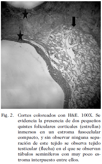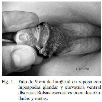 Adolescente de 16 años de edad con aspecto fenotípico masculino, consultó a nuestro hospital por presentar ginecomastia bilateral importante. Manifestó mantener relaciones sexuales con pareja femenina desde los 14 años de edad. Negó la presencia de hematuria cíclica, secreciones penianas, dolor o infecciones urinarias. Dentro de los hallazgos patológicos al examen físico evidenció mamas de aspecto y tamaño acorde a paciente femenino de la misma edad. En el examen físico las gónadas no fueron palpadas, el vello pubiano fue de distribución femenina, el falo midió 9 cm de longitud en reposo, con hipospadia glandar y curvatura ventral discreta (Fig. 1). El cariotipo fue 46 XX. La ecografía pélvica evidenció genitales internos femeninos. La uretroscopia evidenció orificio patológico a nivel de uretra posterior el cual se correspondió con la vagina. No fue realizada uretrocistografia. La evaluación endocrinológica incluyó un Test de estimulación con Hormona Adrenocorticotropa (ACTH) que descartó la presencia de Hiperplasia Adrenal Congénita, como primera causa de ambigüedad genital en un paciente con gónadas no palpables al examen físico; y un test de estimulación con Gonadotropina Coriónica Humana (GCH), tres dosis de 2000 UI, que demostró ausencia de modificaciones significativas tanto en los valores de testosterona total como estradiol (Tabla I). Luego de la evaluación psicológica y discusión multidisciplinaria del caso clínico, aceptación del comité de bioética de la institución y obtener el consentimiento de los padres, se decidió practicar: mamoplastia reductora, gonadectomía e histerosalpingectomía laparoscópica, además de colocación de prótesis testiculares, todo en un solo tiempo quirúrgico. El paciente se negó a la corrección de la hipospadia, alegando que no le producía limitaciones para tener relaciones sexuales. Para la gonadectomía y extirpación de restos müllerianos, se siguió la técnica laparoscópica estándar: insuflación peritoneal de dióxido de carbono (presión de 12 mm de Hg). Se utilizaron 3 puertos de 10 mm; uno umbilical y uno en cada fosa iliaca. Se observaron genitales internos de aspecto prepuberal. Previa visualización de ambos uréteres, se procedió a realizar histerectomía y gonadosalpingectomía bilateral; ambos ligamentos lumboováricos fueron ligados con clips y seccionados con bisturí armónico, mientras que las arterias uterinas fueron ligadas con grapas y seccionadas con bisturí armónico en la base del ligamento ancho, cerca de la inserción vaginal. La vagina fue disecada y dividida de su unión profunda con la uretra con 2 asas endoscópicas de sutura Vicryl 0 (ácido poliglicólico). Los restos müllerianos fueron retirados a través de la incisión infraumbilical. La duración de la cirugía laparoscópica fue de 90 minutos. No hubo complicaciones y se dejó sonda vesical durante 6 días posterior a la intervención. El paciente se alimentó por vía oral el mismo día de la intervención al recuperarse de los anestésicos, y egresó al séptimo día de la cirugía una vez que se aseguró que no tenía dificultad para la micción. El examen histológico reportó útero prepuberal, trompas de aspecto normal y ovotestis bilateral (Fig. 2). El paciente ha evolucionado sin infecciones del tracto urogenital, trastornos miccionales o incontinencia urinaria 24 meses posteriores al procedimiento. El aspecto estético de los genitales externos, posterior a la colocación de prótesis es excelente. Actualmente recibe reemplazo hormonal con testosterona y refiere sexo ocasional con pareja del sexo femenino.