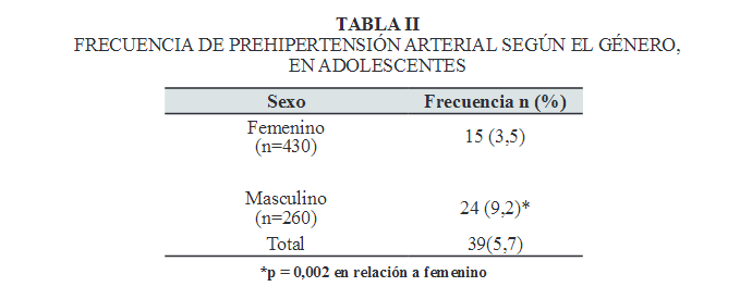 Los análisis de los resultados de este estudio evidencian la presencia de prehipertensión en los adolescentes participantes. La prehipertension se presentó en el 5,7% (n = 39) de la muestra considerada. Al dividir esta muestra estudiada según el género, se pudo observar que el 9,2% (n=24) de los participantes masculinos presentaron prehipertensión, mientras que, en el grupo de las mujeres, la condición se evidenció en un 3,5% (n = 15), con una diferencia estadísticamente significativa (p=0,002).