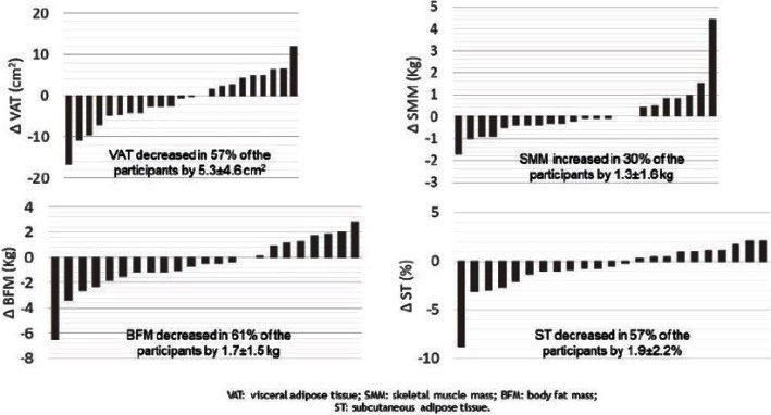 In individuals with OW or Ob, no significant positive changes were found in biochemical indicators after training by group (Table 1). However, when each participant was analyzed, it was found that TG decreased in 39% of the participants by 25±14.7%, Glu in 61% by 22±10%, TCho in 74% of individuals by 24±10%, LDL -c in 74% by 37±16%, and HDL -c increased in 52% of persons by 20±10% (Fig. 1).Regarding anthropometric measurements and BC after training, persons with OW presented a statistically significant decrease in WC (Table 1). Also, when each participant was analyzed, it was found that VAT decreased in 57% of the participants by 5.3±4.6cm2, ST in 57% by 1.9±2.2%, BFM in 61% of individuals by 1.7±1.5kg, and SMM increased in 30% by 1.3±1.6kg (Fig. 2). In addition, it was observed that one person with Ob passed to OW and two with OW passed to NW; furthermore, two persons with increased VAT passed to normality.