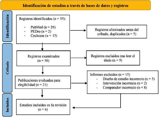 La búsqueda bibliográfica resultó en un total de 35 estudios, 20 procedentes de PubMed, 2 de PEDro y 13 de Cochrane. Tras la eliminación de duplicados (n = 5), se analizaron el título y resumen de los 30 artículos restantes, eliminándose 9 estudios más. En una segunda fase, se evaluaron los 21 estudios a texto completo, descartando 15 estudios por no ser ensayos clínicos (n = 5), no realizar fisioterapia (n = 2) y no evaluar variables de interés (n = 8). A continuación, se revisaron las bibliografías de los artículos incluidos y de algunos de los excluidos, para buscar estudios adicionales relevantes, pero no se encontraron nuevos estudios de interés. Finalmente, se seleccionó un total de 6 artículos 14-19 (Fig. 1).