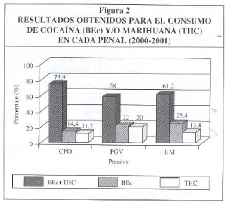 Del total de muestras de orina analizadas (478) en los tres penales, 228 (47,7%) resultaron positivas para los metabolitos de las drogas en estudio, correspondientes a un 58,1%, 37,0% y 52,8% de las muestras en CPO, PGV e IJM, respectivamente.