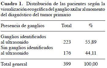 En nuestra experiencia se logró identificar ganglios axilares mediante el ultrasonido, con la condición de anormalidad o no, en 223 de 399 pacientes, representando un 55,89 % (Cuadro 1).