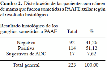 Observamos que en 223 de 399 pacientes estudiadas (55,89 %) se identificó una anormalidad suficiente en la axila, que pudiera corresponder a un ganglio y en consecuencia se practicó una PAAFE de ese ganglio (Cuadro 1). En 114 de 223 (51,12 %) se identificó metástasis de cáncer de mama en los ganglios sometidos a PAAFE (Cuadro 2).