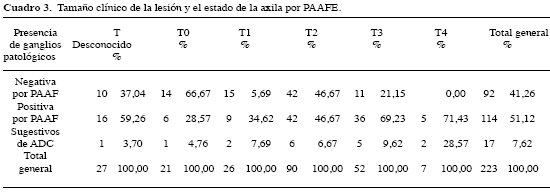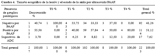 Se puede observar como aun en los tumores pequeños T1 la PAAFE es capaz de identificar un 34,62 % de las metástasis cuando el tamaño es determinado por examen físico y en un 40 % cuando ese tamaño es ecográfico.