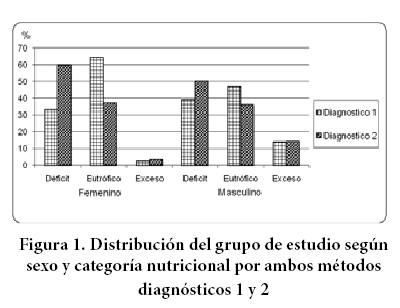El estado nutricional evaluado por ambos métodos: diagnósticos 1 y 2, desagregados ambos en 3 categorías según sexo, demostró una proporción similar de obesos por ambos procedimientos; sin embargo, las frecuencias para el déficit resultaron considerablemente mayores con el diagnóstico 2 y para los eutróficos con el diagnóstico 1 (Figura 1).