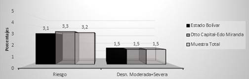De los 7.252 escolares de 3 a 18 años, 51,3% son del sexo masculino y 48,7% femenino. En el estado Bolívar se evaluaron 5.011 preescolares y escolares y en DC-EM 2.241. La prevalencia de desnutrición aguda (DA) moderada y severa en los 1.022 preescolares de 3 a 5 años fue de 1,5%, semejante en ambas localidades, mientras que, en la categoría de riesgo se encontró (3,1% y 3,3%), ligeramente más alta en DC-EM (Figura 1). El sobrepeso fue mayor en DC- EM (2,2 vs 0,5%) (Cuadro 2). La severidad de la DA, el sobrepeso y la obesidad fue mayor en el sexo masculino en ambas localidades (Cuadro 3).