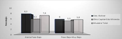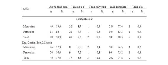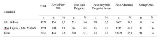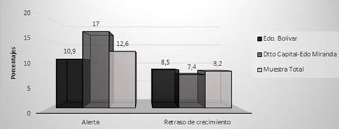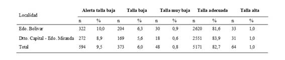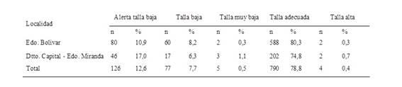 Los valores promedios en estas localidades se ubicaron entre los percentiles 50 y 75 de los valores de referencia del Estudio Nacional de Crecimiento y Desarrollo “Proyecto Venezuela” (14).