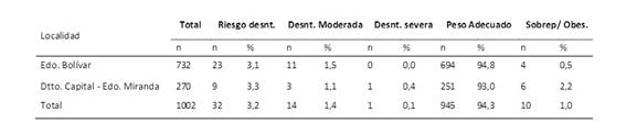 En la zona suburbana de Los Chorros, Caracas, 2013 se midieron 94 niños y 112 niñas y encontraron 18,9% de peso bajo, 16% de sobrepeso y 6,3% de Obesidad (4). En diferentes municipios del Estado Lara entre febrero y marzo de 2019, en 130 niños entre 0 a 10 años se encontró 45% con algún grado de desnutrición leve, aguda o crónica, esta última más acentuada en los niños y niñas mayores de 5 años. El 80% de los motivos de consulta fueron diarreas crónicas e infecciones respiratorias, lo que confirmó el círculo vicioso de desnutrición- infección en estas comunidades (5).