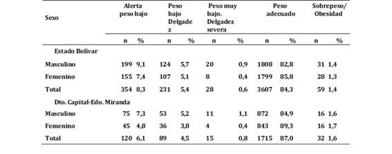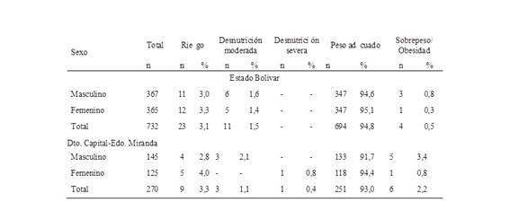 Los preescolares del estado Bolívar resultaron con mejor estado nutricional que los niños en las escuelas del estado Anzoátegui, debido al bajo consumo de alimentos en estas zonas y a la presencia de factores ambientales negativos y alta morbilidad infectocontagiosa que incrementa la desnutrición. Situación que coincide con lo reportado en otros estudios en distintas localidades del país (5),(6),(7).