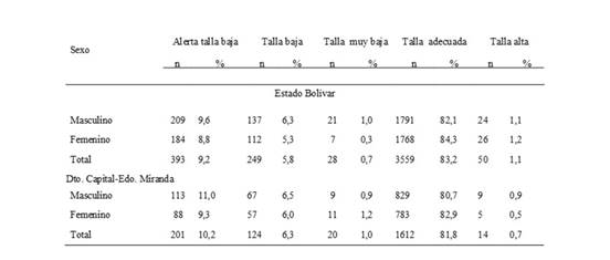La talla baja y muy baja en los escolares de 6 a 18 años fue de 6,8%, mayor en el sexo masculino (7,2%