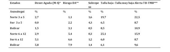 Fuente: Proyecto de educación nutricional en la escuela en Caracas, Miranda y Bolívar (10). *DA (M-S) = Desnutrición aguda moderada y severa; ** Riesgo de Desnutrición Aguda; ***Alerta TB-TMB= Alerta Talla baja y Talla muy baja