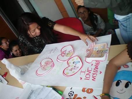 Utilizando la estrategia didáctica de los libros de gran formato, se crean libros inicialmente con los estudiantes de la licenciatura, lo que les pemitió comprender la estrategia y sensibilizarse frente a la oportunidad investigativa en este contexto. En esta aplicación, los estudiantes empezaron a narrar sus experiencias de vida más fácilmente. La elaboración de los dibujos los ubicaron en estrecho contacto con sus sentimientos, demostrando que mientras el estudiante se estaba divirtiendo, era más sencillo expresar sus narrativas respecto a las experiencias vividas. Lo anterior generó un primer acercamiento a la intensión del taller como recolector de la información ya que los estudiantes no se sintieron intimidados, ni usados como un objeto de estudio.