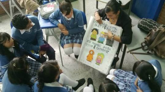 Posteriormente, se aplicó la estrategia de los libros de gran formato con la población de la muestra, lo cual permitió recolectar sentires y experiencias significativas de estos estudiantes. Al igual que con los estudiantes de la licenciatura, el taller generó otro tipo de dinámicas en los estudiantes del colegio puesto que afloraron diferentes experiencias y sentires respecto a la situación problema de la investigación y a situaciones que se generan por la realidad misma de la institución. Para codificar los datos que se fueron generando, se utilizó la técnica de codificación por color, la cual permitió establecer relaciones entre las categorías de información que surgieron en el desarrollo del taller y que los estudiantes de la licenciatura registraron en su diario de campo.