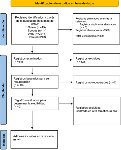 Este estudio ha considerado como método la revisión sistemática, siguiendo las directrices establecidas por PRISMA 2020 (Page et al., 2021), según su diagrama de flujo y lista de verificación. La revisión sistemática se llevó a cabo en las bases de datos Scopus, WoS y Scielo, dado que son las de mayor prestigio a nivel internacional e iberoamericano, y que incluyen investigaciones en el ámbito educativo (Repiso et al., 2017; Prada et al., 2024).