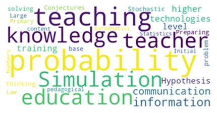Las palabras clave son extraídas en cada uno de los artículos analizados. Como se puede apreciar en la Figura 2, en total son 38 palabras clave, de las cuales la mayor frecuencia corresponde a probability (4 veces), teaching (3 veces) y education (2 veces).