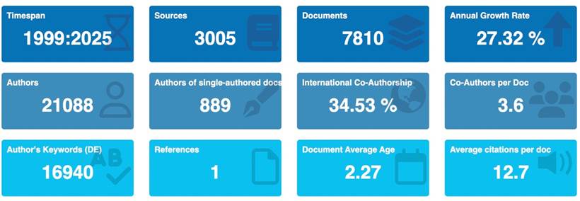 El análisis bibliométrico abarca el periodo 1999-2025. Se identificaron 7.810 documentos publicados en 3.005 fuentes. La tasa de crecimiento anual es del 27,32 %, indicando un aumento en la producción científica. El estudio cuenta con 21.088 autores, de los cuales 889 han trabajado en documentos de autoría única. El 34.53 % de los documentos presentan coautoría internacional, y el promedio de coautores por documento es 3.6. Se registraron 16.940 palabras clave. El promedio de citas por documento es 12,7 reflejando su impacto en la comunidad científica. La edad promedio de los documentos es 2,27 años, lo que indica que es un campo con publicaciones recientes (Figura 1).