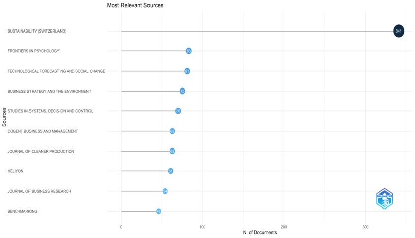 Dentro de la zona 1, se identificaron las 10 principales revistas que concentran la mayor cantidad de publicaciones. Entre ellas, "Sustainability (Switzerland)" lidera con 341 artículos, seguida de Frontiers in Psychology (83 artículos), Technological Forecasting and Social Change (81 artículos) y Business Strategy and the Environment (75 artículos). También se incluyen revistas como Studies in Systems, Decision and Control, Cogent Business and Management, Journal of Cleaner Production, Heliyon, Journal of Business Research y Benchmarking, con publicaciones que oscilan entre 46 y 70 artículos (Figura 3).