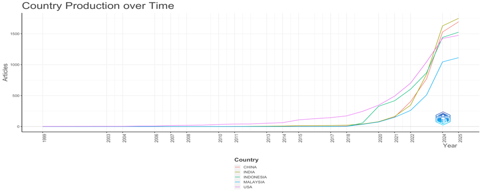 La figura 4 muestra como la producción científica ha aumentado en los últimos años, con una mayor concentración en China, India, Indonesia, Malasia y Estados Unidos. Hasta 2015, la producción fue baja en todos los países. A partir de 2016, comenzó a crecer, con un aumento más pronunciado desde 2020. En 2023, India registró 845 artículos, China 770, Indonesia 868, Estados Unidos 1.045 y Malasia 510. En 2024, India alcanzó 1.627 artículos, China 1.528, Indonesia 1.441, Estados Unidos 1.424 y Malasia 1.045. India y China tuvieron el mayor número de publicaciones en 2024, seguidos por Indonesia y Estados Unidos con cifras similares. Malasia mostró un crecimiento menor en comparación con los otros países.