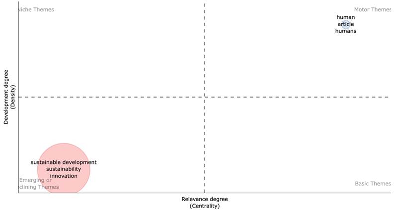 Por otro lado, en el cuadrante inferior izquierdo (Emerging or Declining Themes), se encuentran los términos "sustainable development", "sustainability" e "innovation", lo que evidencia que estos temas aún están en fase de desarrollo. La baja centralidad de estos conceptos indica que, si bien existen estudios que abordan su impacto, su integración en la literatura sobre liderazgo 4.0 y engagement sigue siendo limitada.