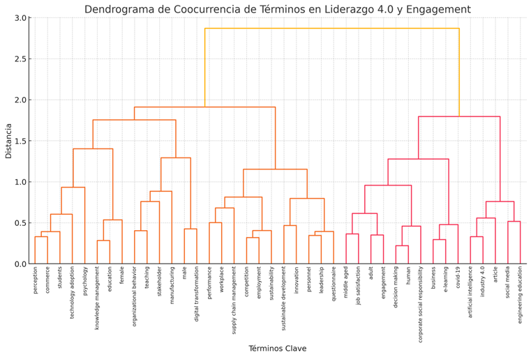 La Figura 7 representa un dendrograma de coocurrencia de términos clave en la investigación sobre Liderazgo 4.0 y Engagement, estructurado a partir de un análisis de agrupamiento jerárquico. La altura de las uniones indica el grado de proximidad entre los conceptos, donde una conexión a menor distancia refleja una relación más estrecha en la literatura analizada. El dendrograma revela dos agrupaciones principales. La primera, ubicada a la izquierda, reúne términos asociados con factores humanos y organizacionales, como "education", "students", "teaching", "stakeholder", "job satisfaction", "knowledge management" y "competition". La proximidad entre estos conceptos indica que los estudios sobre liderazgo han puesto énfasis en la educación, el desarrollo profesional y la gestión del talento como elementos clave en el engagement laboral.