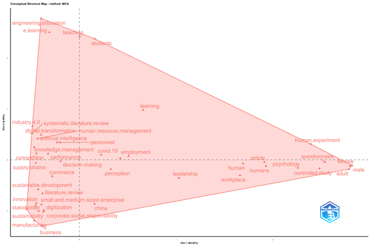 La Figura 8 representa un mapa de estructura conceptual basado en el método de Análisis de Correspondencias Múltiples (MCA), que permite visualizar la distribución y relación de términos dentro del estudio sobre liderazgo 4.0 y engagement. En este análisis, los términos se agrupan en función de su proximidad semántica, lo que permite identificar dos dimensiones principales que estructuran la literatura en este campo.