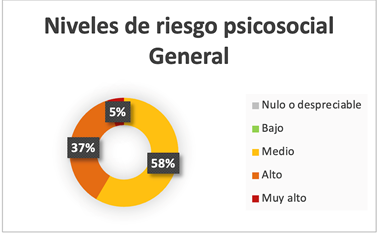 En los resultados generales, de los 41 encuestados, el 58% presentó un nivel medio, el 37% un nivel alto y el 5% un nivel de clasificación muy alto, lo que se traduce en la necesidad de poner especial atención a las causas de estos niveles de riesgo psicosocial, pues pueden repercutir en su desempeño hasta afectarles en su vida diaria.