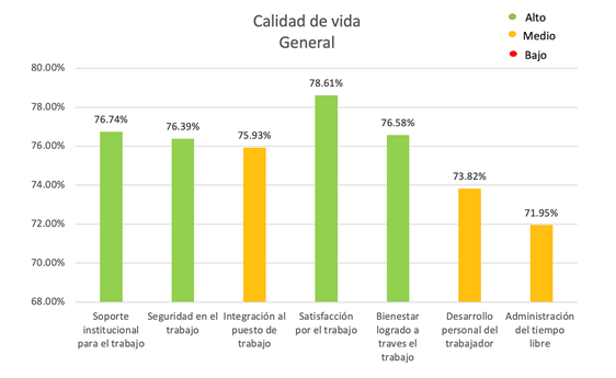 A pesar de los riesgos psicosociales que los colaboradores enfrentan día a día en su trabajo y el peso que esto significa para ellos, la calidad de vida laboral de la muestra general no se vío mermada por ello, pues presentaron altos niveles en la mayoría de las categorías, destacando entre ellas satisfacción por el trabajo, en donde se percibe que a los trabajadores les gusta lo que hacen, sienten que su trabajo tiene un propósito teniendo autonomía y posibilidad de decisión, pues consideran que sus habilidades concuerdan y son bien aprovechadas por el puesto. En segundo lugar, destacó la categoría de soporte institucional para el trabajo, que se traduce en que las personas de la organización perciben recursos suficientes para realizar sus labores, reciben la capacitación y las herramientas necesarias, cuentan con supervisión adecuada además de que sus funciones y responsabilidades se encuentran bien delimitadas.