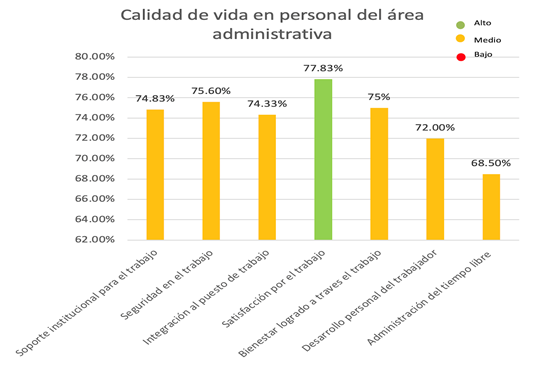 Algunas de estas categorías se observaron un poco disminuidas en el área administrativa pues la categoría de satisfacción por el trabajo fue la única en un nivel alto, las demás categorías, aunque no bajas, se encontraron en un nivel medio muy cerca de la más destacada. La dimensión de seguridad en el trabajo a diferencia de los resultados generales, ocupó el segundo puesto en calidad de vida, lo que significa que los trabajadores administrativos valoran aspectos como el ambiente en su lugar de trabajo, refiriéndonos a características como el ruido, la temperatura o incluso la paga que reciben por la prestación de sus servicios.