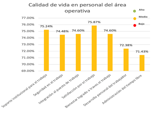 En cuanto al área operativa, el nivel percibido de calidad de vida en el trabajo se fijó con el 27% en un nivel alto, en el nivel medio se identificó igualmente el 27% de la muestra, 28% en nivel bajo y 18% en un nivel muy bajo. Diferente del área administrativa; pues aumentó en un 3% la cantidad de encuestados con calidad de vida en un nivel muy bajo, además de concentrar el 1% menos en los niveles alto-medio.