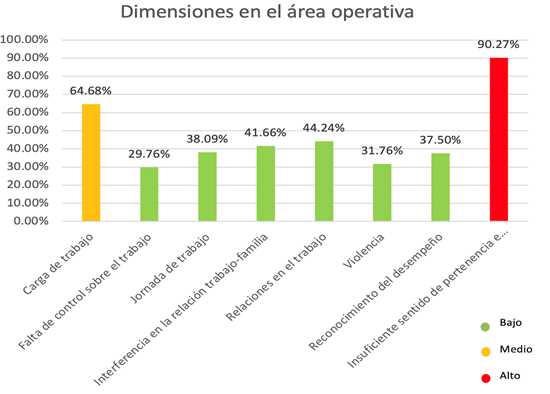 En cuanto al área operativa, de la misma forma el sentido de pertenencia a la empresa era escaso y la carga de trabajo representó un problema, pero a diferencia de los administrativos la cohesión del equipo mejora en gran medida mostrando la categoría de relaciones en el trabajo casi 20 puntos por debajo, lo que denotó compañerismo en esta área. Los resultados más bajos seguían estando en violencia y falta de control sobre el trabajo, pero las posiciones se invierten, siendo el de menos riesgo la falta de control.