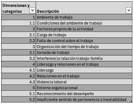 Dicho cuestionario se sometió a análisis factorial por Uribe et. al. (2019) en la Universidad Autónoma de México (UNAM) mediante una muestra de trabajadores de servicios en la ciudad de México, compuesta por 114 integrantes, estratificada por género (51.8% femenino y 48.2% masculino). El cuestionario está compuesto por un total de 72 ítems pertenecientes a 10 dominios y cinco categorías: